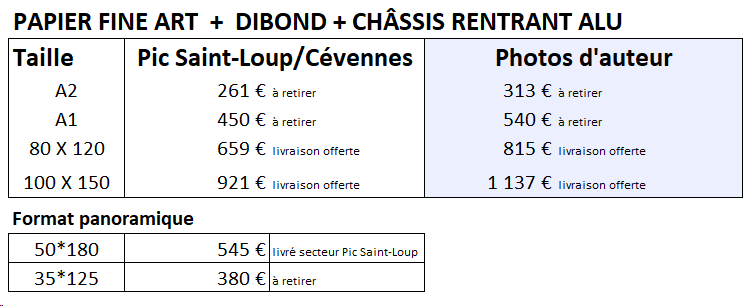 Toutes les photographies présentées sur les réseaux ou sur ce site, sauf cas particulier, sont disponibles à la vente sous forme de tirages, dans les déclinaisons suivantes :